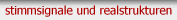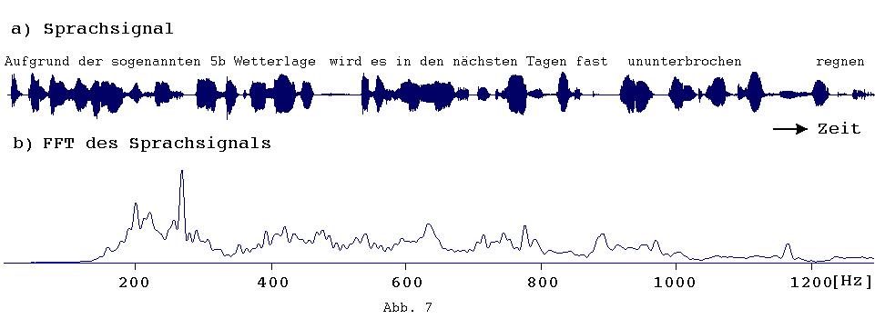 Nun zu dem Ansatz Stimme als Realstruktur. Ein Sprachsignal wurde mit Hilfe eines hochwertigen Mikrofons aufgenommen, im Rechner digitalisiert und ist in Abb. 7a) dargestellt. Bei der vorliegenden Methode wird ein solches Sprachsignal als Realstruktur betrachtet. Von dem Gesichtspunkt der Realstruktur-Forschung beinhaltet ein solches Sprachsignal oder Struktur sämtliche Merkmale einer Stimme. Diese Merkmale (z.B. Frequenzlage, Diffusität, zeitliche Veränderung des Signals, die Korrelation im Signal (Vektoren)) liefern ein Stimmprofil für den Sprecher, wenn sie richtig aus dem Sprachsignal oder der Struktur mathematisch extrahiert werden. Um alle Merkmale der Stimme zu erfassen, muss das Signal eine repräsentative Länge aufweisen. Eine repräsentative Länge liegt bei 40-80 Sekunden Sprachdauer. Zum Vergleich mit den Realstrukturen wird das Sprachsignal von Abb. 7a) in Abb. 7b) fourier-transformiert (Frequenz-Raum). Hier wird der Vergleich zu den Realstrukturen deutlich. Die Maxima sind teilweise diffus und gerade die diffusen Komponenten liefern wertvolle Informationen über die Stimmcharakteristik.