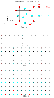 Mein Ansatz, die digitalisierte Stimme als Struktur bzw. Realstruktur zu betrachten, wird hier schematisch erläutert. Man unterscheidet in der Festkörperphysik, Festkörperchemie und speziell in der Kristallographie zwischen idealen Strukturen und realen Strukturen. Gemeint in diesem Zusammenhang ist die Anordnung der Atome oder deren Positionen in einem Festkörper (kristalliner Festkörper). Eine Idealstruktur ist aufgebaut aus periodischen Anordnungen von Struktureinheiten (Elementarzellen) in allen Raumrichtungen (x,y,z). Eine 3-D-Elementarzelle von Kupfer-Gold (Cu3Au) ist in Abb. 1 gezeigt. Einfachheitshalber werden die Strukturen als zweidimensionale Projektionen auf die XY-Ebene dargestellt (Abb. 2). Eine Idealstruktur von Cu3Au ist in Abb. 3 schematisiert. Die Struktur ist in allen Raumrichtungen identisch aufgebaut. Bei höheren Temperaturen (ca. 420°C) wechseln die Cu-Atome und Au-Atome durch Diffusion über die Leerstellen ihre Position im Gitter und es entstehen andere Struktureinheiten, wie gezeigt in Abb. 2. Wenn der Platzwechselvorgang abgeschlossen ist, dann entsteht eine Struktur, bei der alle Strukturvarianten aus Abb. 2 beteiligt sind. Solche Strukturen nennt man fehlgeordnete Strukturen, bzw. Realstrukturen (Abb. 4).